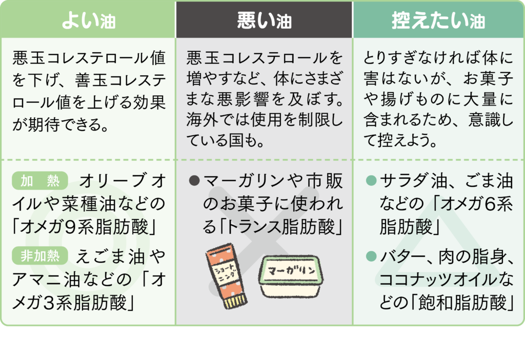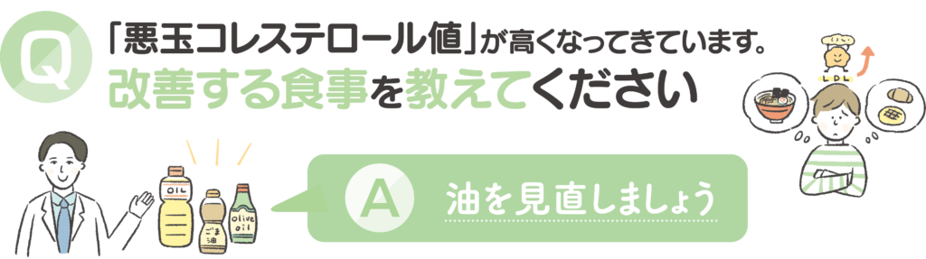 悪玉コレステロール値の改善には、まずは油を見直しましょう。具体的には、「オメガ9」「オメガ3」を積極的に使用し、「トランス脂肪酸」「オメガ6」「飽和脂肪酸」を控えるようにします。