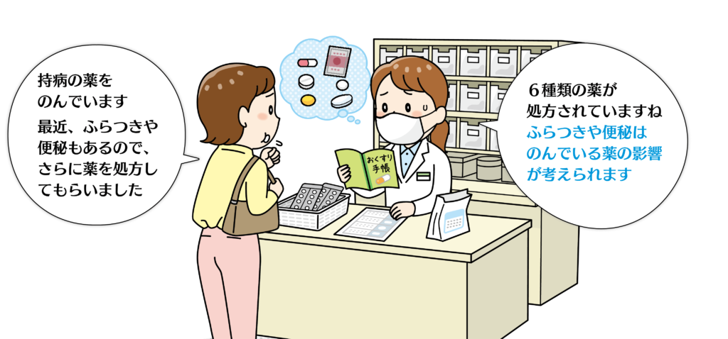 薬物有害事象には、ふらつきや転倒、記憶障害、せん妄、抑うつ、食欲低下、便秘、尿失禁など、さまざまあります。薬が追加されたり、変わったりした後は、とくに注意しましょう。