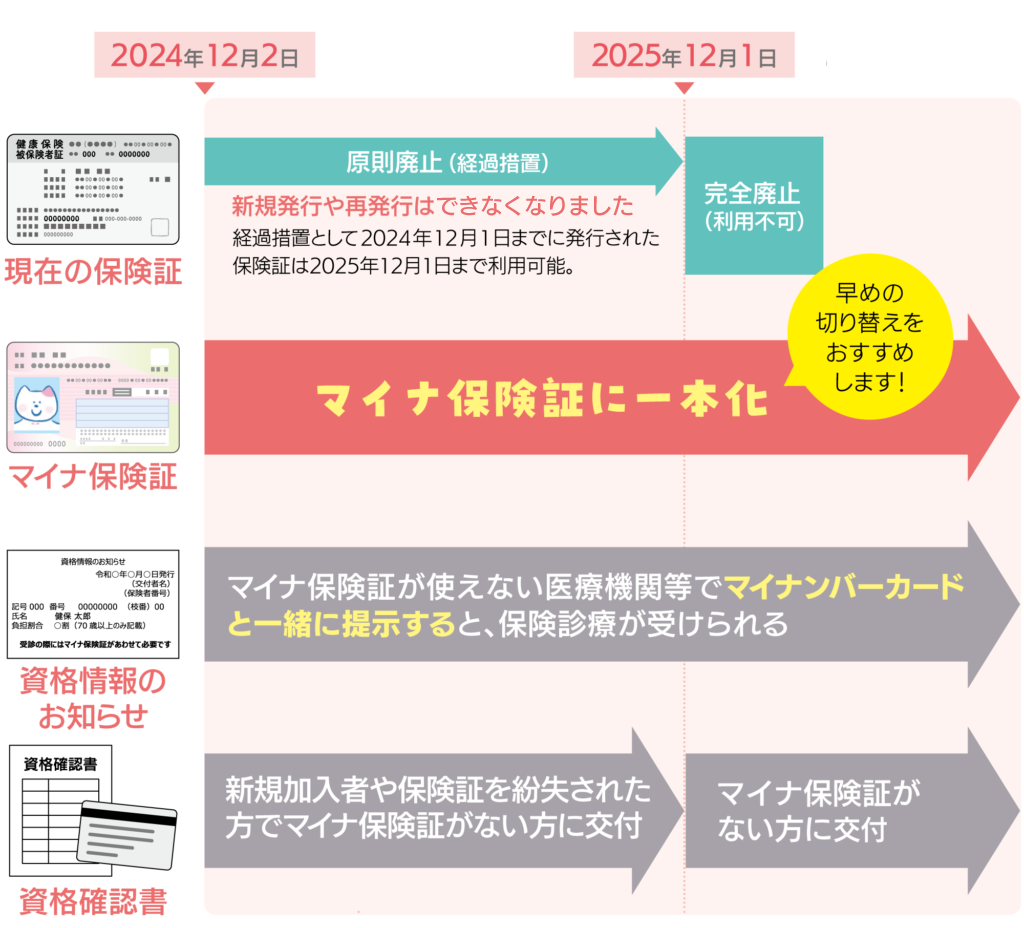 すでにお持ちの保険証は2025年12月1日まで使用できますが、紛失や転職時にも新規発行・再発行ができません。