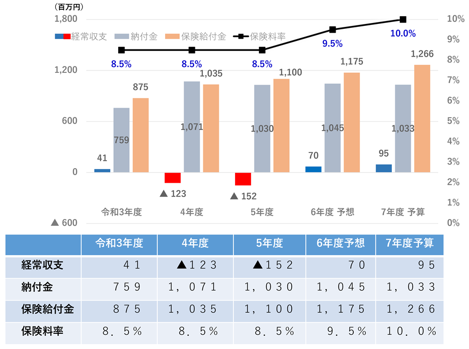 令和6年度決算の経常収支はほぼ予算並みとなる見通しですが、令和7年度予算におきましては、将来負担が増加することが必至な保険給付費や納付金への備え、安定的な保健事業サービスの提供のために、昨年度に引き続き健康保険料率を引き上げ、9.5%から10.0%へ0.5%アップとさせていただきます。介護保険料は1.9%のまま継続します。