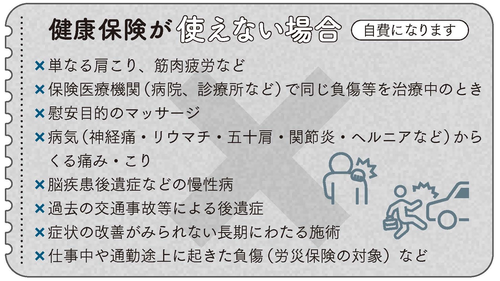 同じけがについて保険医療機関と重複して接骨院等を利用している場合は、接骨院等の施術に健康保険は使えません。ほかの接骨院等で同じけがの施術を受けている場合も同様です。